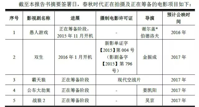 在富春通信发布的报告中可以看出,春秋时代确实投资了多个项目。目前,公司投资的电影项目《寻找罗麦》、《幻想曲》及《致命追击》等影片均已摄制完成;今年7 月,公司主投的《大话西游Ⅲ》已经开机,预计于2016年暑期档推出;正在筹备拍摄的电影作品有5部,除了吴京的《战狼2》以外,还有《霸天狼》《愚人游戏》《双生》《公车大劫案》4部作品。