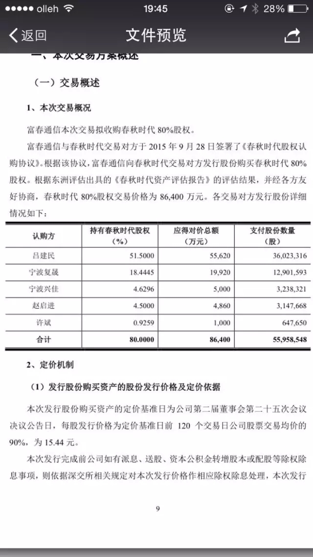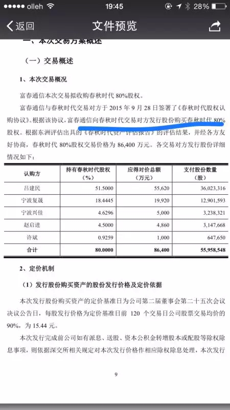 按照春秋时代目前的股权结构,今年8月底,经过第二次股权转让之后,实际控制人吕建民在公司的持股比例为71.5%。在此次收购中,吕建民拿出了51%股权卖给了富春通信。但卖出这部分股权,吕建民并未获得现金,而是获得了上市公司8.26%的股份,成为了上市公司的股东。