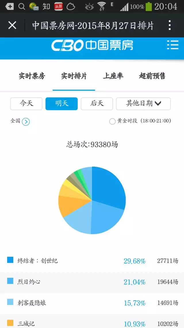 《烈日灼心》《聂隐娘》《三城记》明日同时上映。从预排片情况来看,明日上映的三部影片排片占比分别为21.04%、15.73%、10.93%,总排片量超过45%。