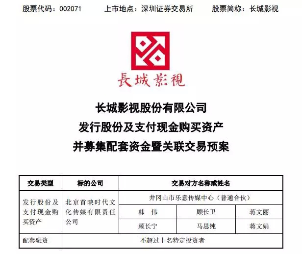 根据11月3日发布的收购预案,长城影视以1.5亿的价格受让吴慧手里的12.5%股权,同时以9.12元/股的价格发行价值8.38亿人民币的股票,非公开发行募集现金2.2亿从顾长卫、蒋雯丽家族手中购买首映时代87.5%的股权。