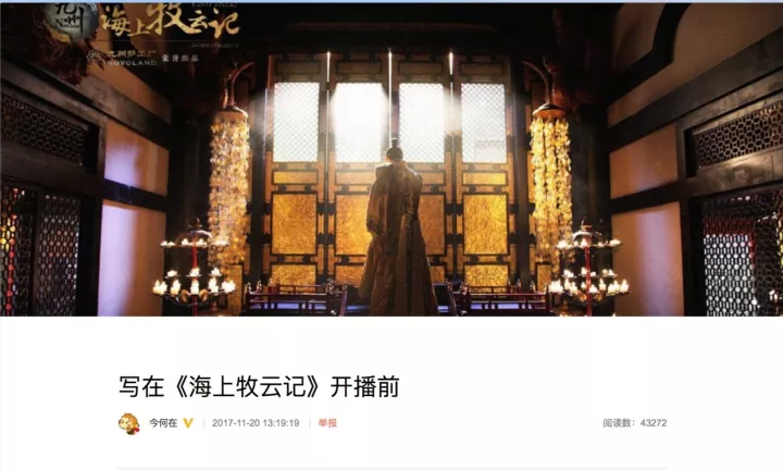 就在《九州·海上牧云记》上线前一天,这部命途多舛的大剧还是没有得到安宁。起因是,原著作者今何在,一大早发了一条信息量巨大的长微博,社交媒体随之沸腾。