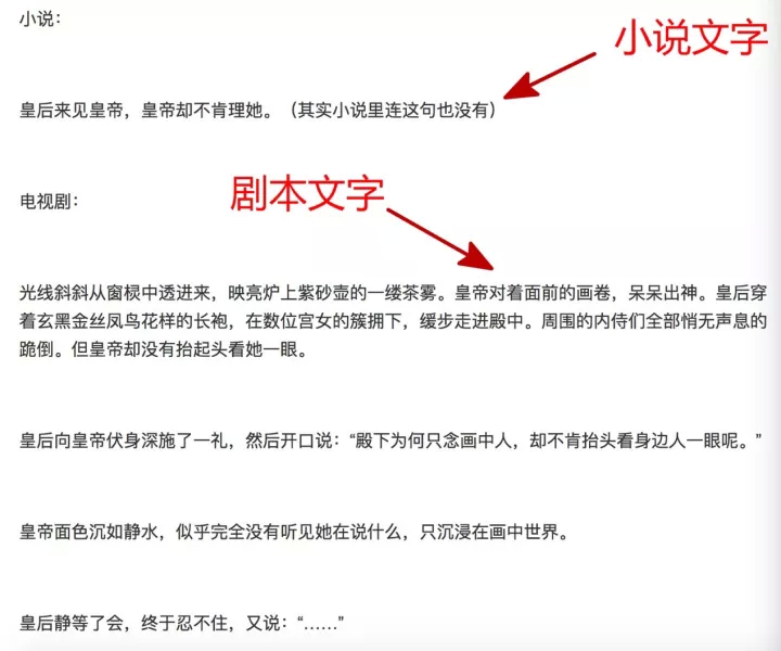 从小说到剧本,讲的仍然是同一件事,有效信息没有增加。增加的文字多是形容词,以及描述事件发生时人物的状态、场景、服化道的细节,但仍然只说了一件事而已呀!事件并没有增加呀!