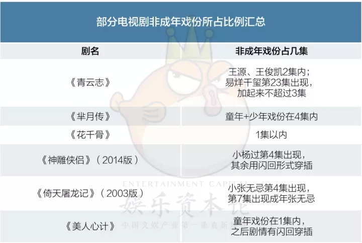 但小娱很有兴趣讨论的是,一部电视剧,少年戏(即非主角戏份)在多少集的比重是合适的呢?在请教了几位业内人士(包括制片人、编剧和导演)以后,我们得出一个结论: