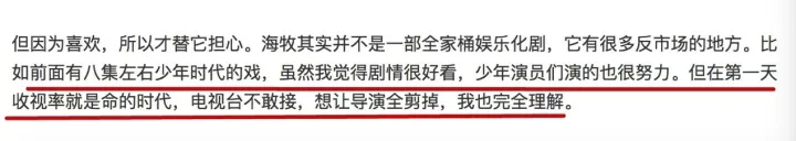 在此之前,《海牧》关于剧情的传言已经太多了,有说前二十集都是少年戏的,也有说前十集,众说纷纭;《海牧》由台网联播大剧成为了纯网剧的原因,也曾有过更夸张的传言,比如“听说空镜很多、人物台词特别少、有一集甚至大半集都是空镜、两个人下个棋都能下半集”,但所有这些,出品方从未正面回应过。