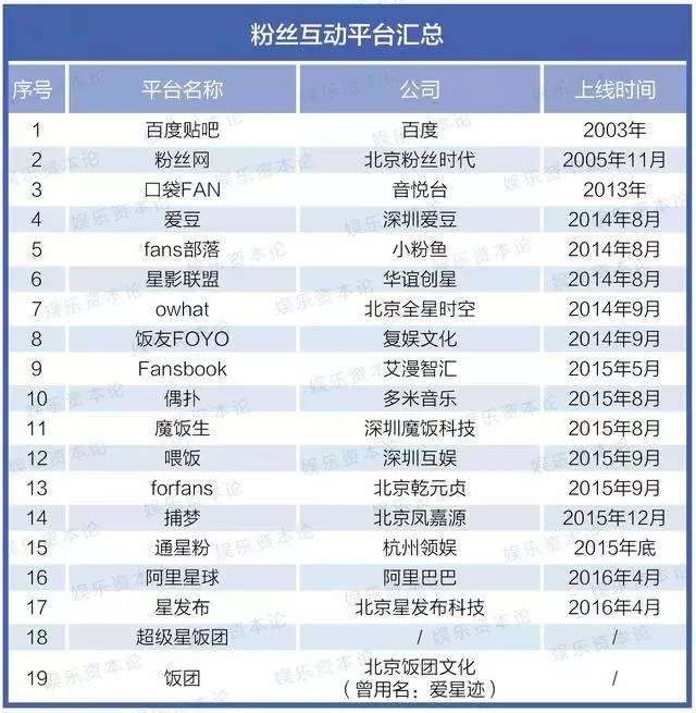 去年9月份娱乐资本论曾报道,据不完全统计,当时市场上的粉丝互动平台已经多达19个,除了比较老牌的贴吧、粉丝网以外,更加垂直的粉丝互动平台在2014年如雨后春笋般涌出,并在阿里入局后形成一个小高潮。(点击蓝字复习)