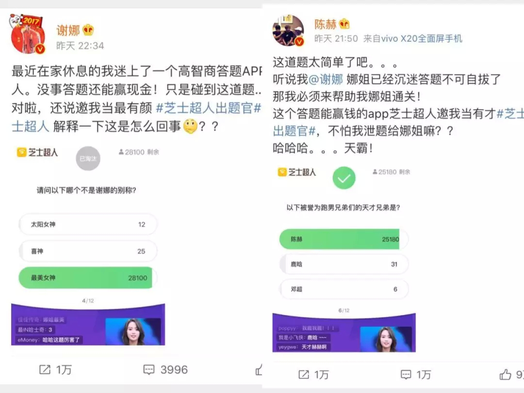 值得一提的是,三者虽在模式上一样,但在题目的设置上,《芝士超人》设计了许多与明星相关的题目,希望借此吸引明星粉丝加入的心可以想见。昨日,题目中所涉及的两个明星谢娜和陈赫就分别发博宣传。