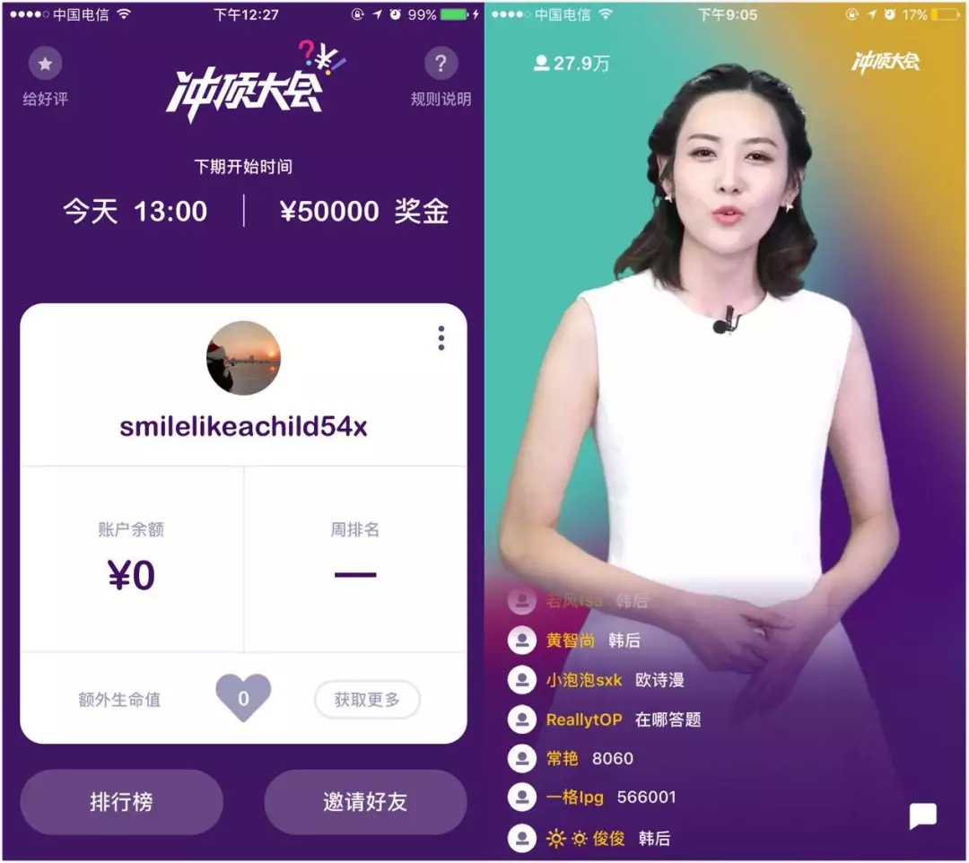 新年伊始,随着国民老公王思聪的一条微博,一款人人皆可参加、答对即可分钱的直播竞答游戏《冲顶大会》横空出世,一时间风靡微博、微信等社交平台。晒排名、共享邀请码以及各种答题活动题库大全、助你拿走十万大奖的新闻层出不穷,场面十分火热。
