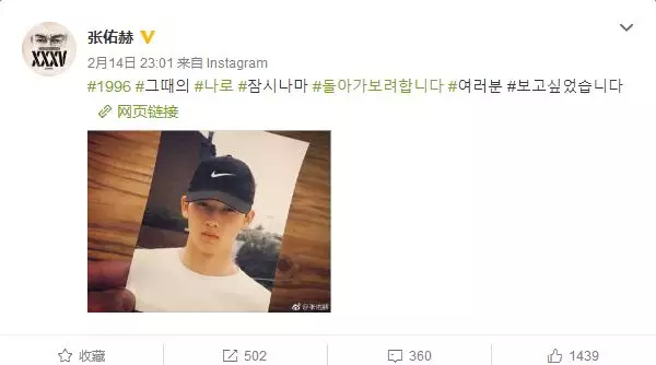 张佑赫2月14日晚也发了微博:“会暂时返回到1996年那个时候的我,很想念大家。”并上传了一张照片。那是1996年的青涩少年,其实与现在的本尊并没有太大差异,岁月真的有善待他们。