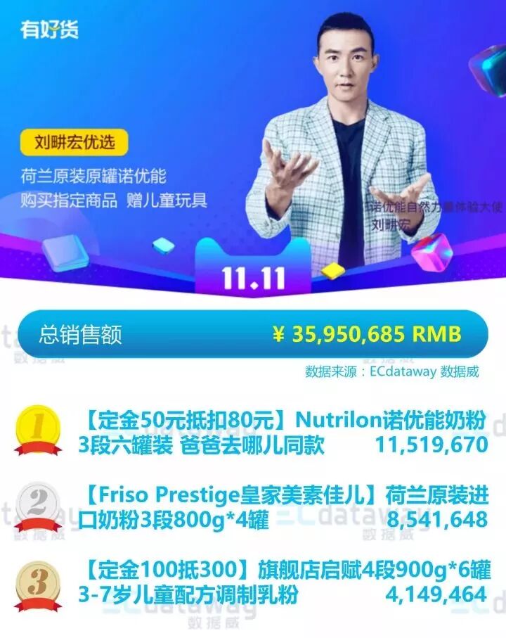 在刘畊宏入口下的总销售额中,诺优能以1151万的销售额位居榜首,这些数据直接说明刘畊宏在担任诺优能自然力量体验大使期间,为品牌造势的热度,转化为实打实的销售量。“刘畊宏+诺优能”,明星形象与产品内容的双赢叠加标签,也让其他品牌主对刘畊宏的带货力有了更多的参考。