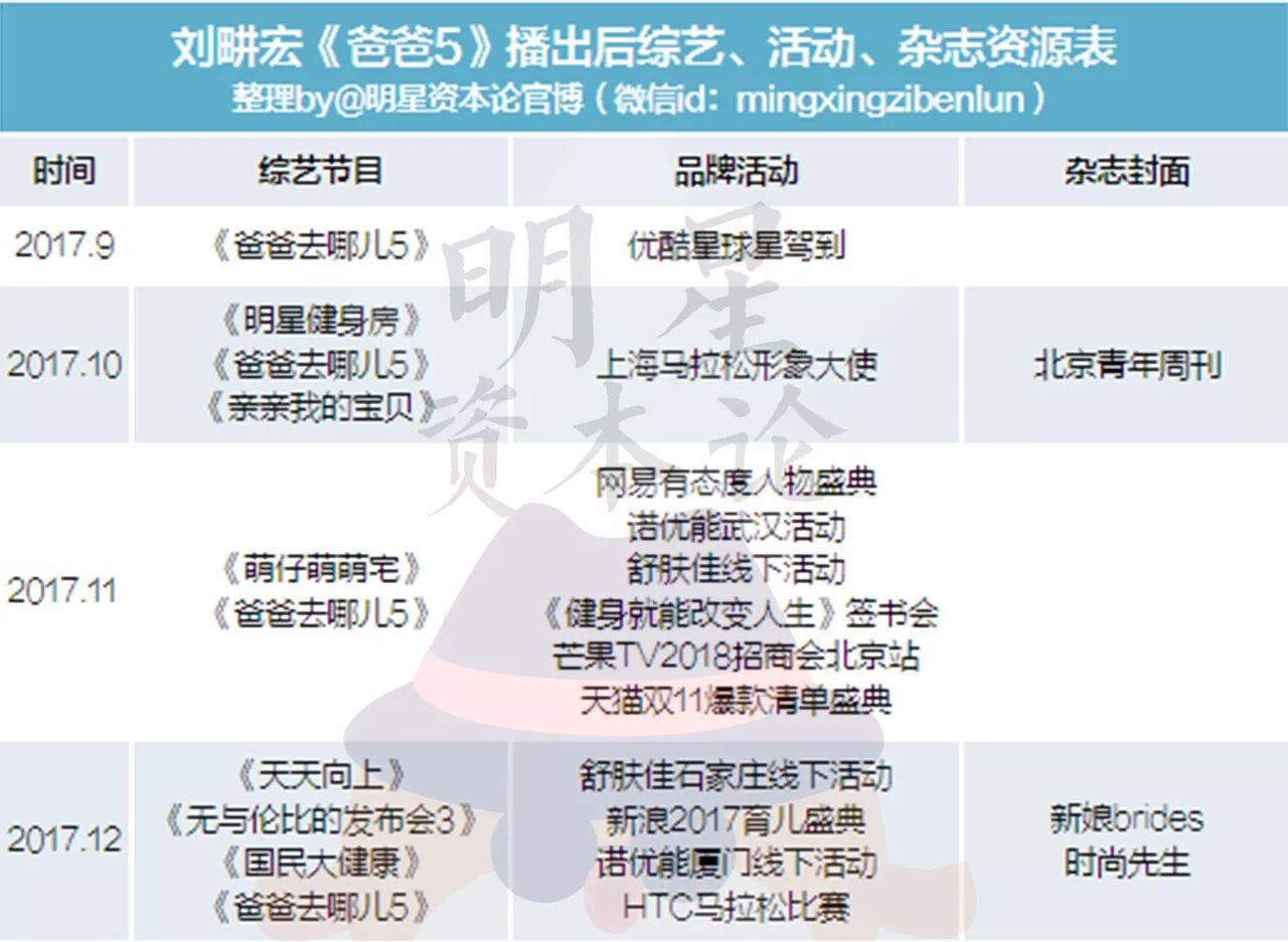 除了热度和声量的变化,我们也整理了爸5节目播出前后,刘畊宏各方面的资源表。