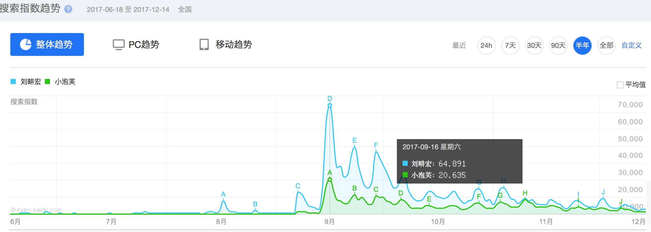 而在百度指数里,我们可以清晰的看到,也是从9月份开始,搜索量有了明显的涨幅。在9月16号达到顶峰,当时已经播到第三周,刘畊宏+小泡芙父女的个人形象及好评率已经稳固。