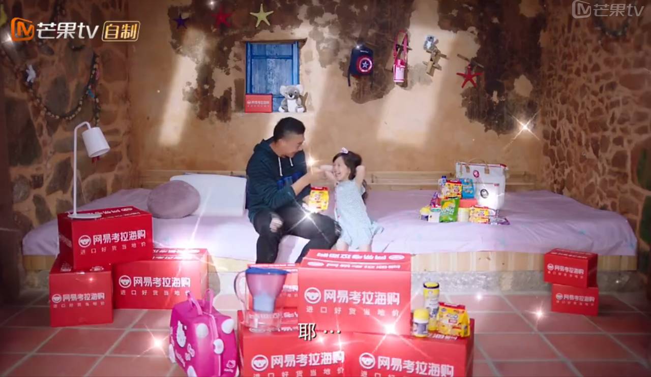 举个例子,在前三期节目当中,刘畊宏&泡芙父女共参与了三条广告的拍摄,品牌主分别为网易考拉海淘、VIPkid儿童英语和舒肤佳。第一期的“萌娃小剧场”出现在节目的第63分钟处,刘畊宏&小泡芙拍摄的网易考拉海淘中插广告,主要剧情在“他们选到了最差房子”之后展开,泡芙抱怨老爸选择了最差的房子,刘畊宏在安抚泡芙情绪的同时,“顺手”拿出了手机开始挑选海淘的商品,呼应节目中的情节,看着并不突兀。