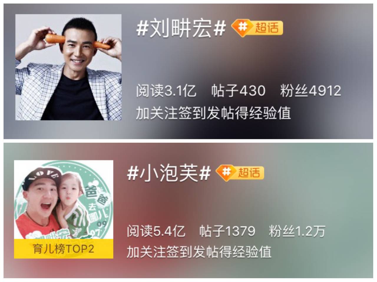 纵观刘畊宏今年的事业版图,#爸爸去哪儿5#可谓是一个分水岭。节目播出期间,刘畊宏个人微博涨粉100多万,#刘畊宏#超话阅读数达到3.1亿,而#小泡芙#的超话阅读数(5.4亿)、发帖量和粉丝数(1.2万),可谓是“碾压”畊宏爸爸了。