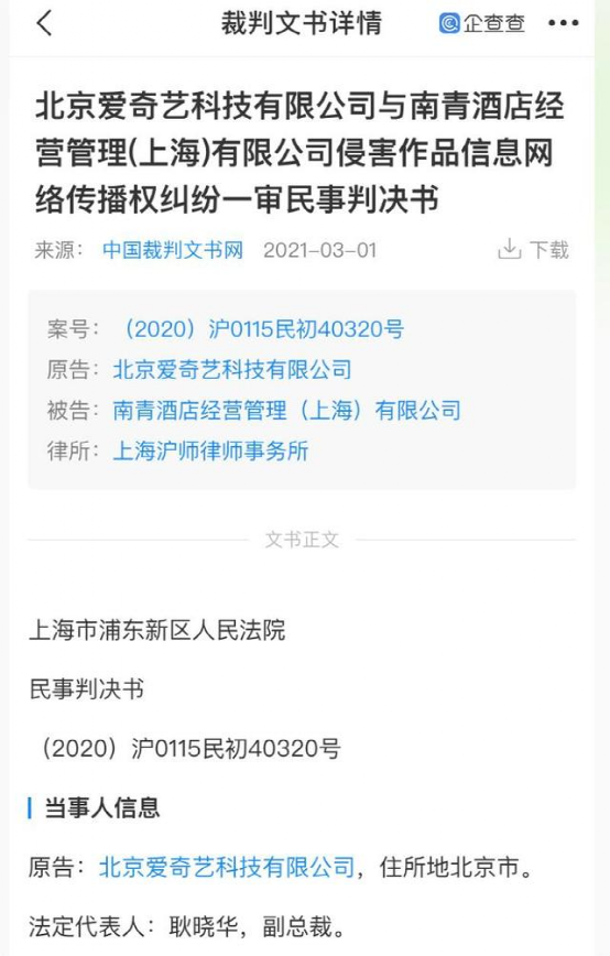 最新一则法院判决书显示,爱奇艺在状告豪华酒店“上海南青华美达酒店”侵权播放影片案件中最终胜诉,由于该酒店在客房内提供《王牌逗王牌》《健忘村》《奔爱》《北京遇上西雅图之不二情书》等影片的在线播放服务,造成了对爱奇艺的侵权,被判赔14万元。