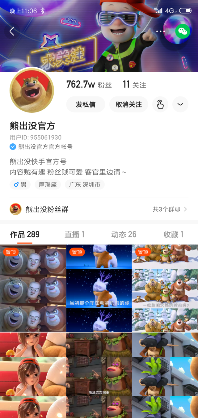 《熊出没》IP早在2018年就在快手上开了官方账号,发布了286个作品,拥有762万粉丝,而且,2020年,熊出没影片的导演还丁亮还在快手做了一场直播。
