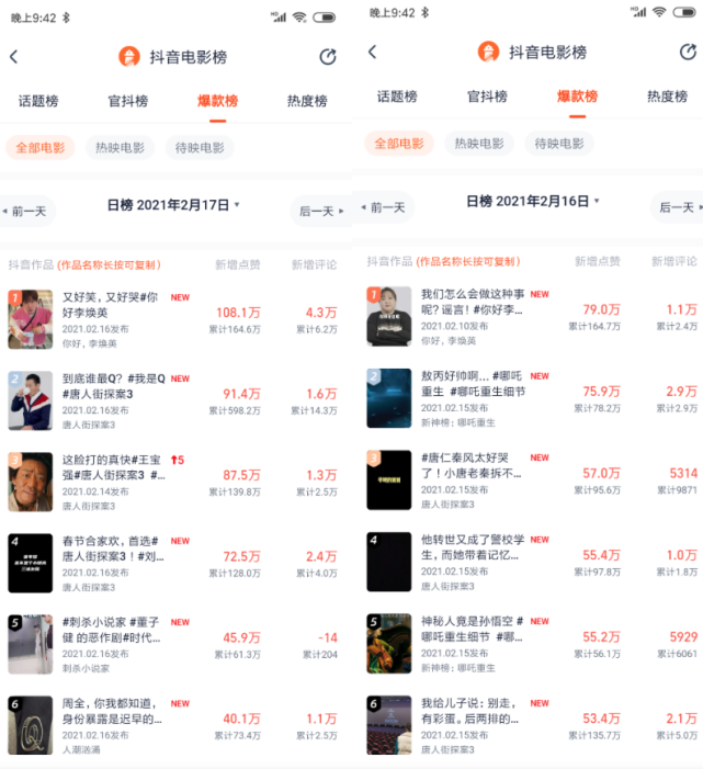 灯塔2月16日~17日春节档影片抖音爆款视频榜布分截图