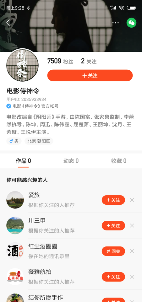 类似的情况还发生在《侍神令》身上。这部由周迅、陈坤主演的春节档电影,虽然在快手上开了官方账号,但官方账号旗下没有任何作品和动态。