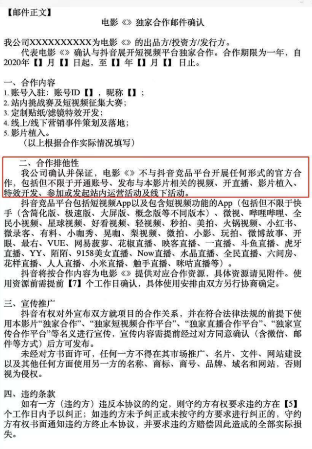 其中规定,电影不与抖音竞品平台开展任何形式的官方合作,包括但不限于开通账号,发布与影片相关视频,开直播,影片植入,特效开发,参加或发起站内以及线下活动。