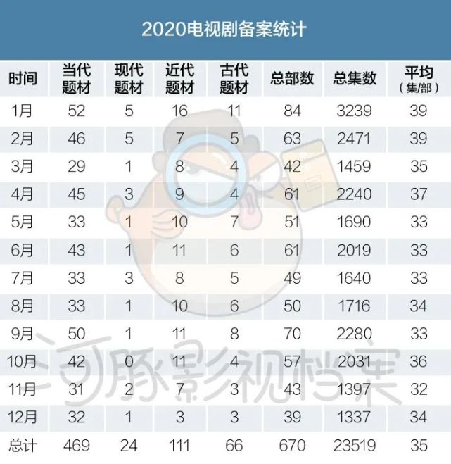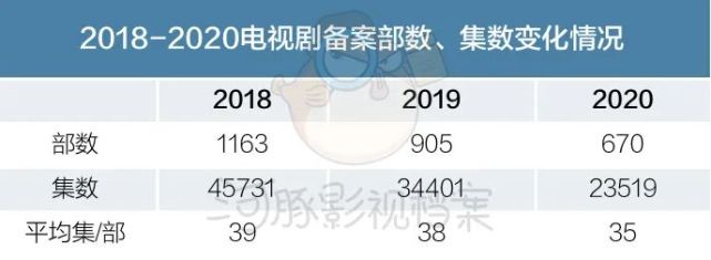 据河豚君统计,2020年全年通过备案的电视剧有670部,23519集,数量下降明显。同时,在2019年广电总局“限集令”风声之后,虽还未有官方明文,但市场是敏感的。2020年电视剧平均每部35集,比2019、2018年的平均每部38、39集有明显减少。
