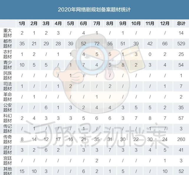 网剧规划备案的题材种类较多,但可看出仍然大多集中在都市题材,共计529部,占比过半;其次为传奇题材,有260部,占比24%;农村、青少、公安、科幻、武打也为网剧备案中较为热门的题材,每月基本维持稳定备案数。
