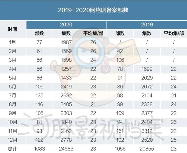网剧方面,2020年规划备案的网络剧有1083部,共24683集,平均23集/部。由于重点网络剧备案公示制度实施于2019年2月,2019年2-12月的1056部规划备案数与今年水平基本持平。
