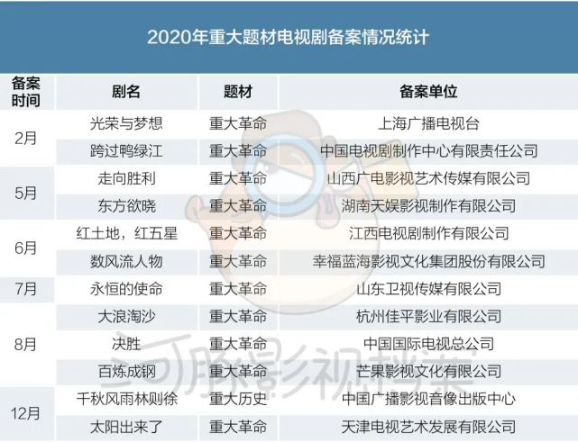 值得注意的是,2020年电视剧重大题材备案数增加,共有12部,相比19年的8部增长50%。2021年是主旋律题材大年,在2020年2月备案的《跨过鸭绿江》已经在CCTV1播出,收获不俗反响,接下来的二、三季度更是有一系列重大题材电视剧即将上线。