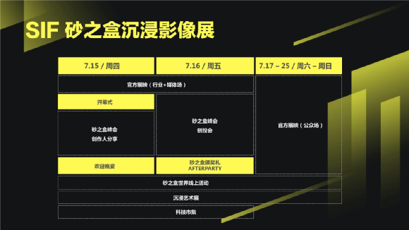 SIF 2021将设置主题峰会、官方展映、沉浸艺术展、创投单元、市集与砂之盒颁奖礼等六个主单元,主题峰会环节将邀请到海内外行业大咖,针对新内容、新技术等行业热门话题进行深入交流,官方展映将在超过3000平的展映空间中,为观众带来50余部展映作品,并对其中大部分作品进行装置化设计。而作为历届SIF的重要环节之一,创投单元将邀请到入围2020年砂盒计划的孵化团队以及通过征集入选创投单元的原创团队来到现场,SIF主办方还将为到场嘉宾准备丰富的社交活动。