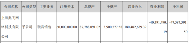 根据财报来看,因线下渠道的销售业务受到疫情影响,奥飞在去年的玩具销售收入同比下降了21.86%。旗下负责玩具销售的全资子公司广东奥迪和上海奥飞净亏损分别2061.35万元和4758.74万元;负责游乐服务的全资子公司奥飞动漫净亏损2574.99万元。