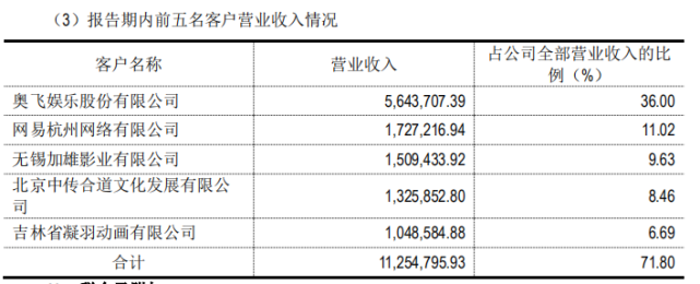 大千阳光在2020年的动画电影收入为564.34万,同比下降77.39%,动画电影的新增业务几乎停滞。这也与电影项目工作量较重,导致公司过于依赖大客户所致。2020 、2019 、2018 年,公司前五名客户累计销售量占比分别为 71.79%、80.23%和 89.35%。2020年,奥飞娱乐贡献营收5643.71元,占总营收比重36%。