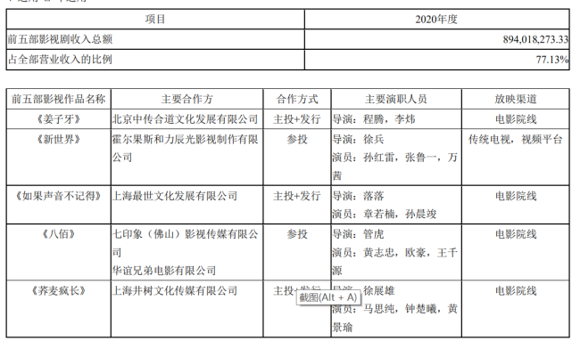 光线传媒更是凭借公司主投、主控的动画电影《姜子牙》获得4亿营收。《姜子牙》于去年国庆档上映,取得了超过16亿元的票房成绩,刷新了动画电影首日票房记录。2020年,光线传媒的前五部影视剧收入总额为8.94亿,《姜子牙》便占比近半。光线传媒去年的营收和净利润为11.59亿、2.91亿,同比下降59.04%和69.28%。