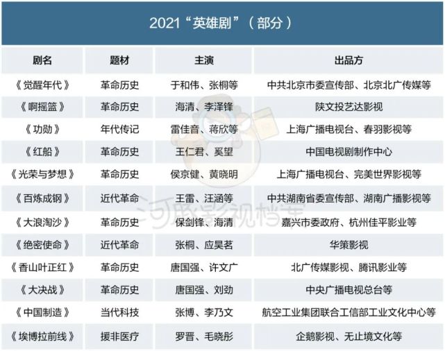 从目前预排的“英雄剧”片单来看,生产这类剧集的主要有三大群体。一是国营的影视制作单位,如央视旗下的中国电视剧制作中心,二是老牌民营影视公司,如华策影视、完美世界影视等;三是互联网影企如腾讯影业、企鹅影视等。