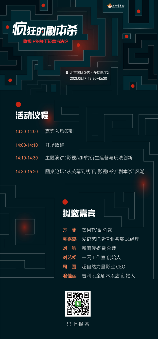 8月17日下午,北京国际电影节期间,由娱乐资本论主办的行业对话:“疯狂的剧本杀:影视IP的线下运营方法论”在北京国际饭店多功能2厅举行。我们将聚焦影视文旅、剧本杀、密室逃脱等线下娱乐业态,探讨影视IP的线下运营——剧本杀的运营、创新与机遇,并邀请影视综、剧本杀行业领军人物,多位行业大咖来分享他们的经验与心得。