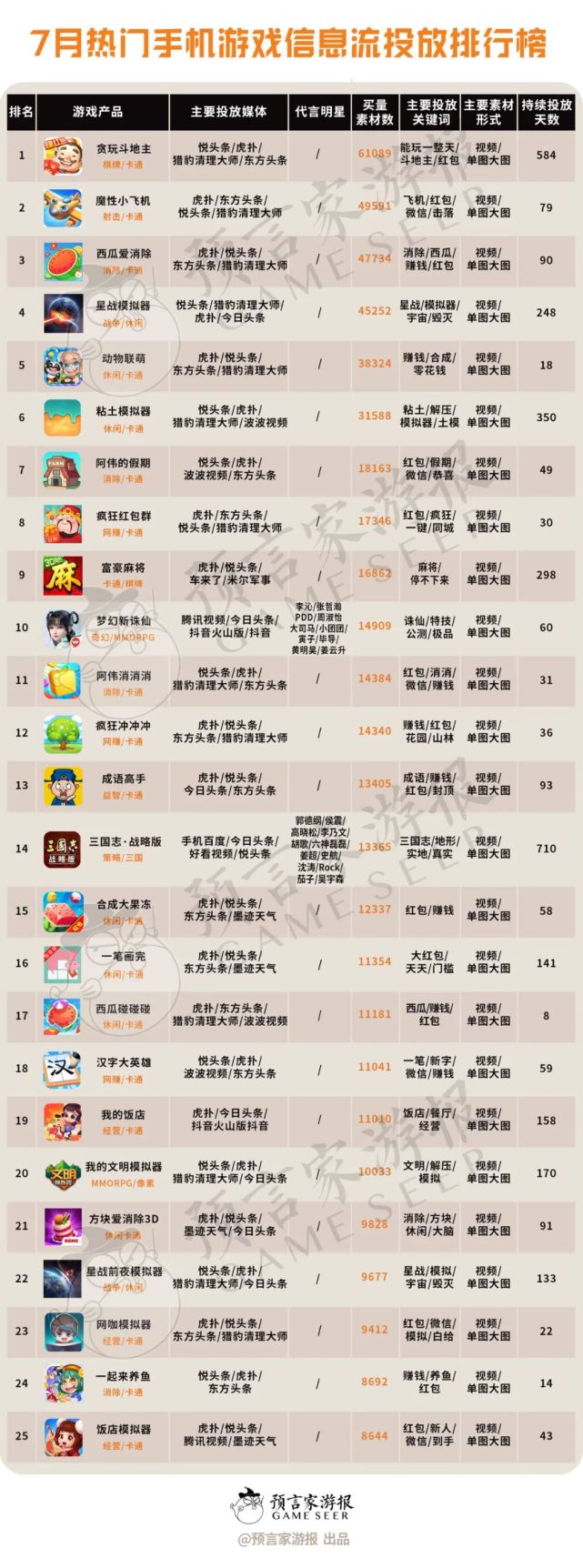 7月游戏投放市场与前几个月最大的不同,就是大部分素材数都被休闲游戏所挤占,明星投放大幅度降低。根据预言家游报统计,7月买量榜TOP25的游戏中,仅有《梦幻新诛仙》和《三国志·战略版》两款游戏邀请了明星代言人。放大到整个投放市场中,明星代言这种表现形式的素材数也是最少的,仅占整体投放量的4.26%。