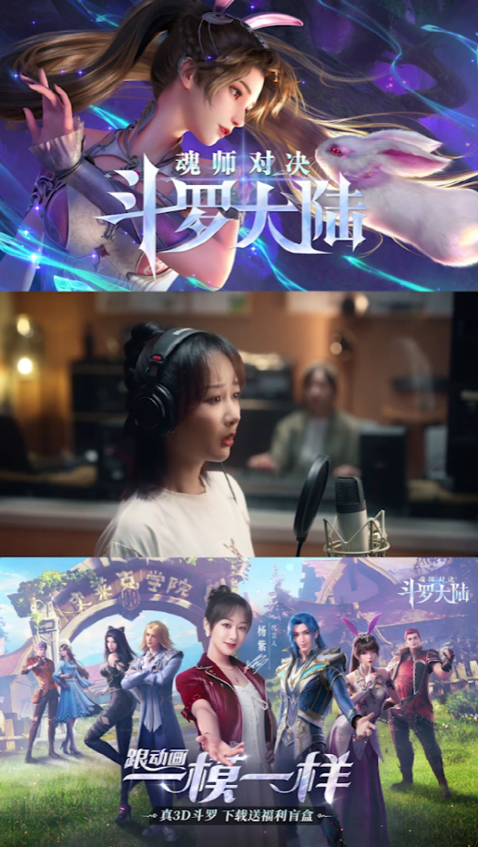 《斗罗大陆:魂师对决》选择杨紫也是类似的思路,但是他们制作的买量素材却另辟蹊径,以杨紫主视角揭秘的方式介绍游戏,展示游戏的制作过程。另外在素材中,杨紫也一再强调游戏“跟动画一模一样”,诣在向受众传达这款游戏是根据动画改编的。