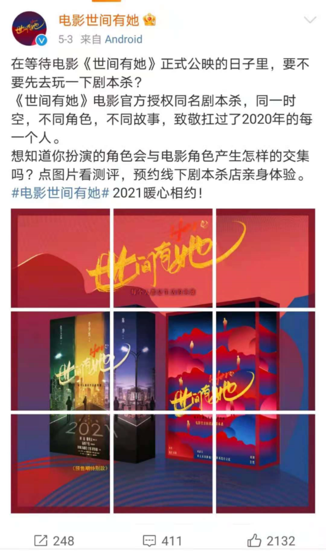 在这两种发行方式之外,董文洁规划中的《世间有她》剧本杀会将电影故事和剧本杀游戏故事相结合:“我们会根据不同的发行窗口期,剧本杀第一轮发行时主推与电影故事相关的盒装本,再之后根据特定人群比如家庭再推家庭本。”