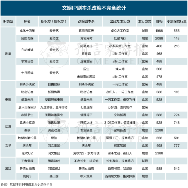所以IP合作方式也会影响到IP剧本杀的发行方式。当下市场上IP本大部分采用盒装的方式来发行,因为盒装不限制购买数量,在预言家游报统计的表单中,盒装本的数量是城限本的两倍还多。