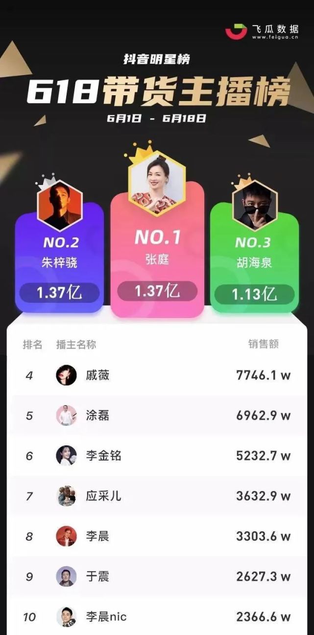 另一位明星代表是朱梓骁。从去年独家签约愿景娱乐以来,已经成功转型为知名带货主播。目前,他在抖音上有729万粉丝,今年3.8女王节当天持续带货10小时,GMV达到5400多万。根据第三方数据统计,朱梓骁3月直播GMV高达2.5亿,仅次于罗永浩;618期间,朱梓骁带货1.37亿元,在带货主播榜单中排名第5,明星榜单中排名第2。