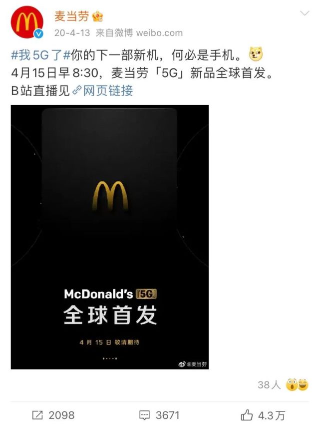 比如,2020年4月,麦当劳宣布将在B站直播“5G新品全球首发”。科技感十足的视觉设计和文案,激发网友各种脑洞猜测:“5G点餐机器人?”“麦当劳也要做手机了?”万众关注下,麦当劳大中华区CEO张家茵走进B站,首次亲自直播带货,在B站分享了传说中的5G新品“麦麦脆汁鸡”。