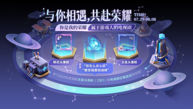 剧集播出阶段,玩家进入游戏中即可看到《你是我的荣耀》相关推广。同时,《王者荣耀》推出了深度定制的剧游联动运营活动,玩家完成相应的社交任务,比如与朋友进行组队,为朋友点赞等,即可获得剧集衍生的棉花头像框、玉兔头像框和乔晶晶于途的定制语音包等丰厚奖励。这些任务上的设计,也进一步与剧集所要传递的内容映射,凸显《王者荣耀》社交性和互动性的天然属性。