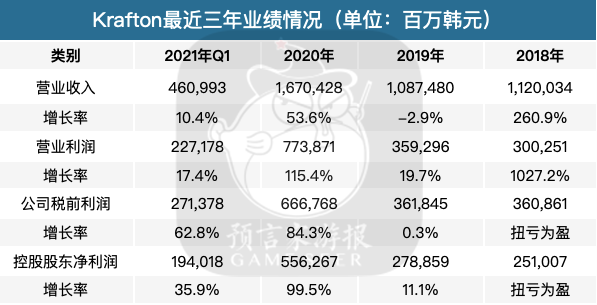 到了2020年,疫情为其游戏业务带来强势加成,其营收达到1.67万亿韩元,相比2019年上涨了53.6%。而今年第一季度,Krafton的营业收入同样实现了10.4%的增长,达到了4610亿韩元。