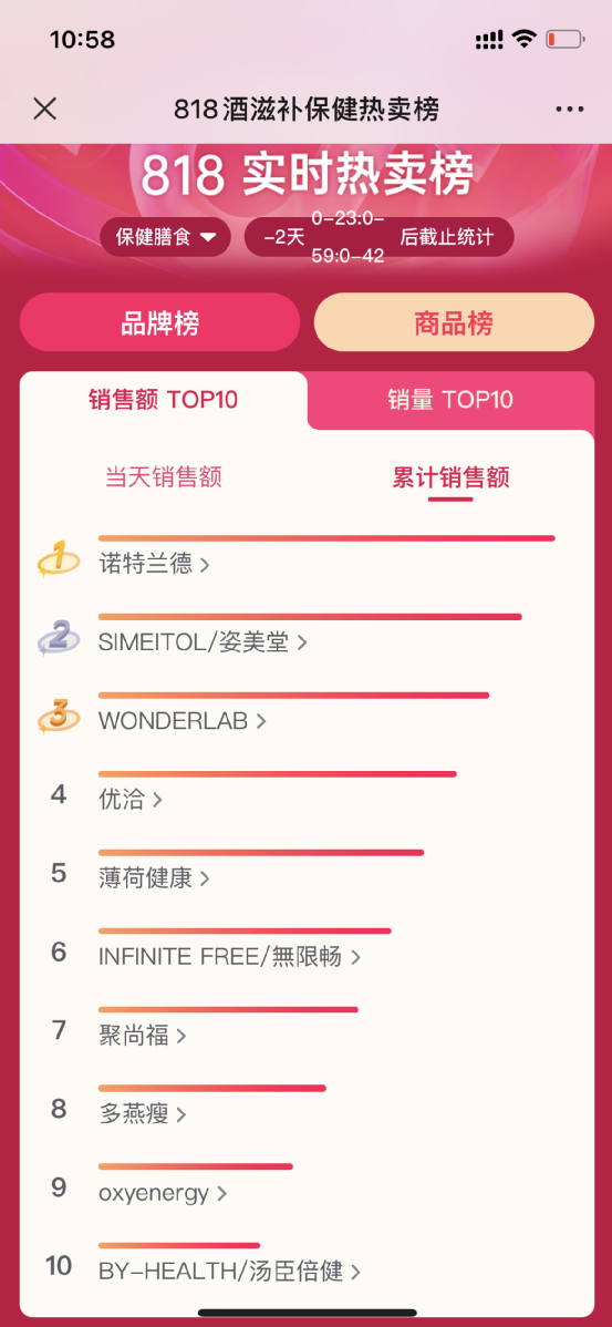 比如,保健品领域排名第一的品牌是诺特兰德,818期间销量达到174.7万。其中维生素是诺特兰德的爆品,单款维生素30天销量超过200万;排名第三的品牌是欧嘉莱尼,销量137万,该品牌推出的一款日本沐浴露成为抖音最火的爆品之一。