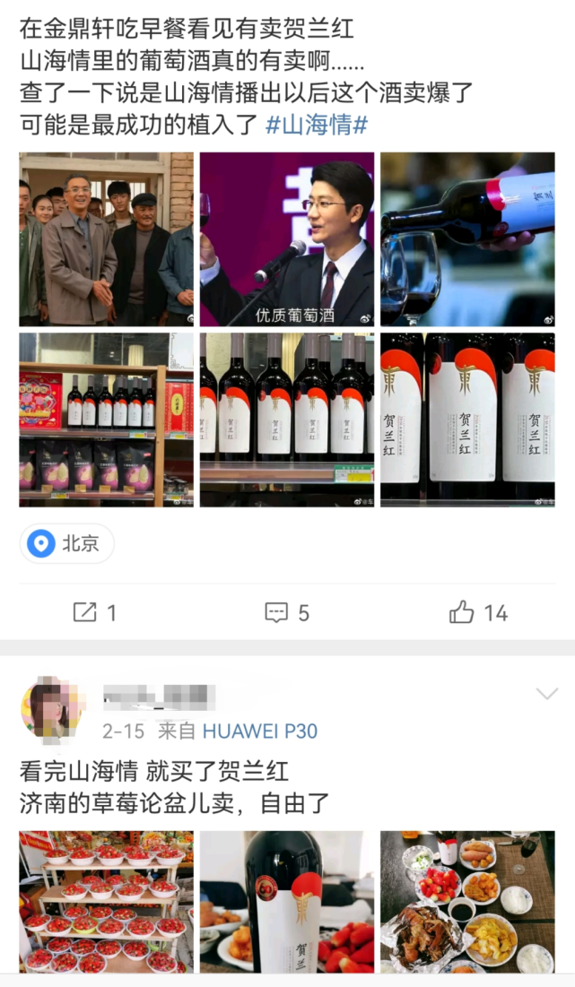 以《山海情》为例,剧中闽宁镇的特产“贺兰红”葡萄酒,剧播期间其同款在京东、天猫等电商平台创造了一个月3000多万的销售额,足见主旋律剧的强“带货”力。