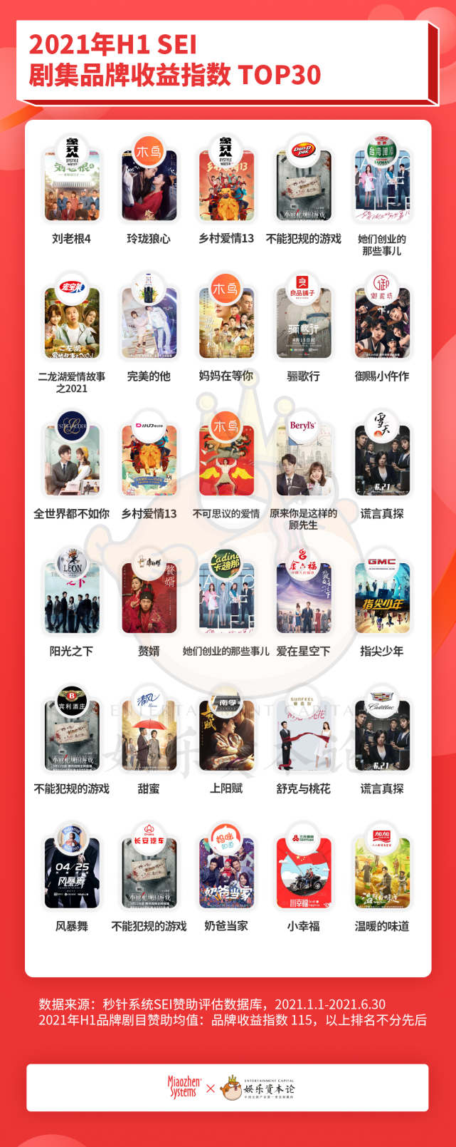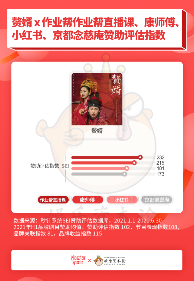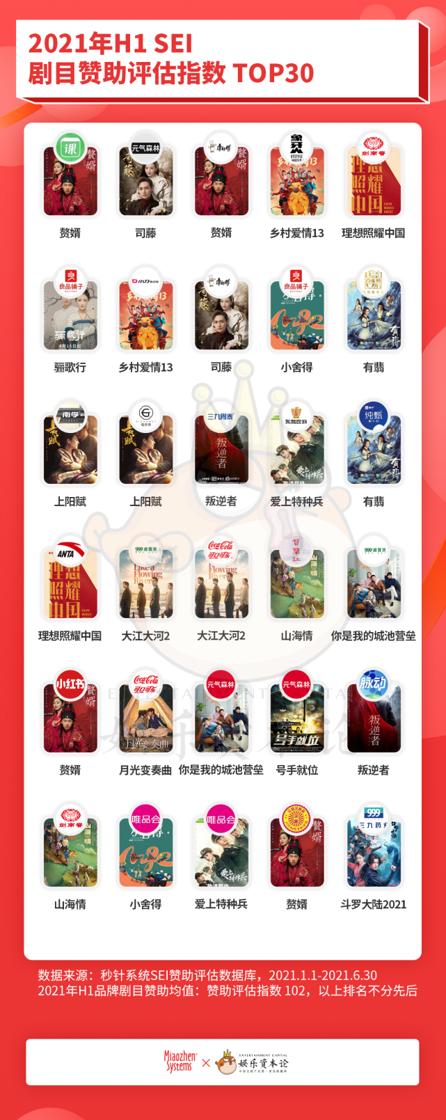 上半年的剧集赞助评估指数Top30榜单中,《赘婿》相关赞助品牌上榜最多,包含作业帮直播课、康师傅、小红书和京都念慈庵四席。