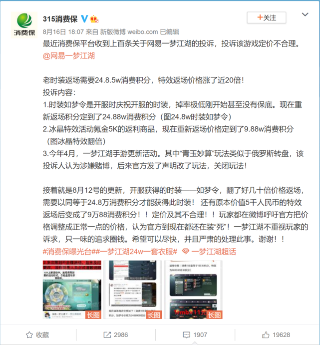8月16日,中国电子商会旗下消费服务保障平台@315消费保发布微博,表示他们近期接到了上百条关于网易《一梦江湖》的投诉,投诉该游戏定价不合理。尤其是开服时内测的老服装如梦令重新返场,需要投入24.8万元人民币才能获得。