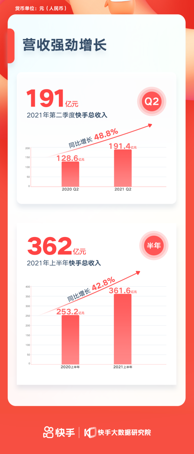 8月25日,快手发布了Q2财报,二季度营收191.38亿元,同比增长48.8%。经过收入结构的不断优化后,线上营销服务占比52.1%,直播收入占比37.6%,其他服务(包括电商)收入占比10.3%,日活用户日均使用时长同比增长25.2%。