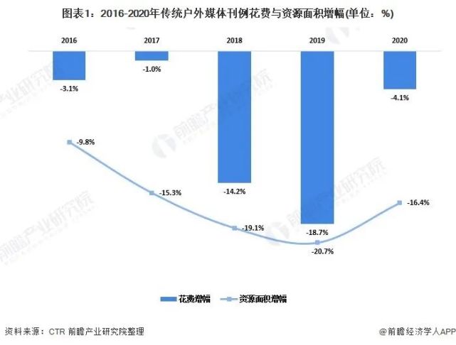 从整个行业来看,传统户外广告已日渐式微。2016-2020年,传统户外媒体刊例花费和资源面积呈下降趋势,2018年与2019年尤甚。2020年,传统户外广告花费同比减少4.1%,资源面积同比下降16.4%,下降速度才稍微有所放缓。