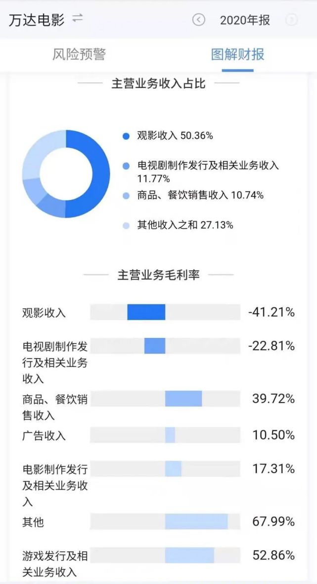 从2020年主营业务收入占比来看,万达电影的观影收入占据半壁江山,电影与电视剧制作发行及相关业务收入占比为19.02%,商品、餐饮销售收入占比为10.74%,广告收入占比为9.50%。