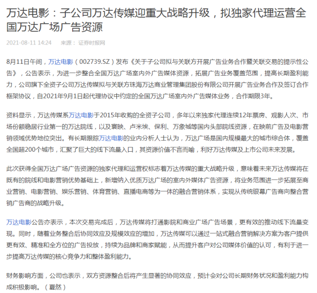 根据万达电影的公告,万达传媒与珠海万达商管开展广告业务合作及签订合作框架协议,自2021年9月1日起,由万达传媒代理协议中约定的全国万达广场室内外广告媒体业务,合作期限3年。