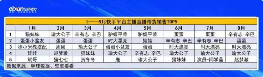 不过,援引亿邦动力的数据可以看出,除了辛选旗下的利益关系绑定最深的蛋蛋、时大漂亮、猫妹妹、赵梦澈这些“老人”之外,并未看到新人有突出的表现。