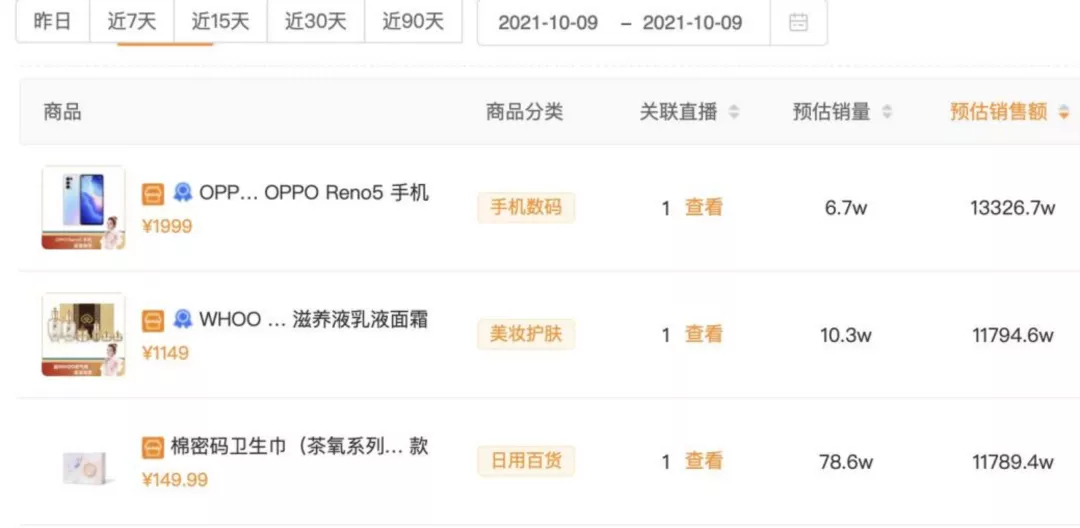 飞瓜数据显示,当日,蛋蛋共计带货49款,有6款产品GMV超3000万,单品GMV过亿的有3个。分别是GMV排名前三的OPPO Reno5手机,1.33亿;Whoo天气丹花献套盒,1.17亿;棉密码卫生巾套装,1.17亿。